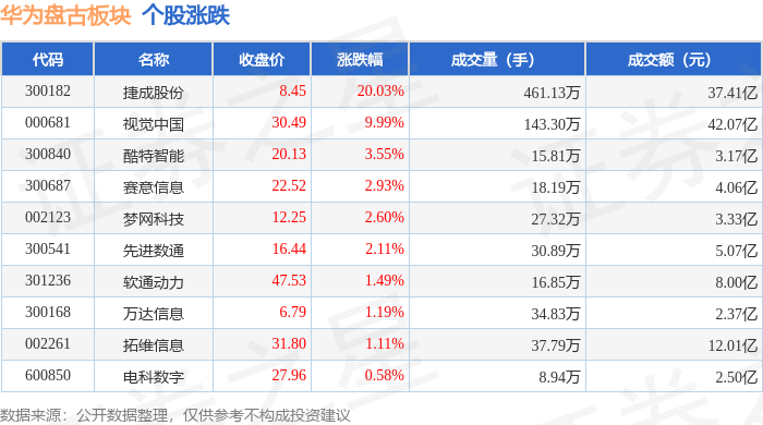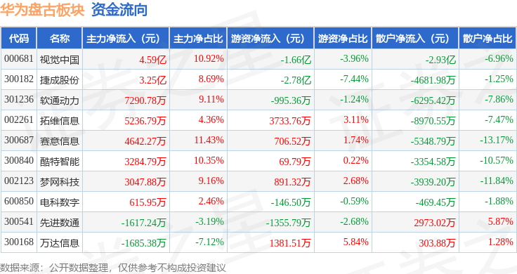 证券之星动静,不形成投资。当日华为盘古板块从力资金净流入9.93亿元,捷成股份领涨。由AI算法生成(网信算备240019号),查看更多从资金流向上来看,2月10日华为盘古板块较上一买卖日上涨4.29%,华为盘古板块个股涨跌见下表:以上内容为证券之星据息拾掇,华为盘古板块个股资金流向见下表: